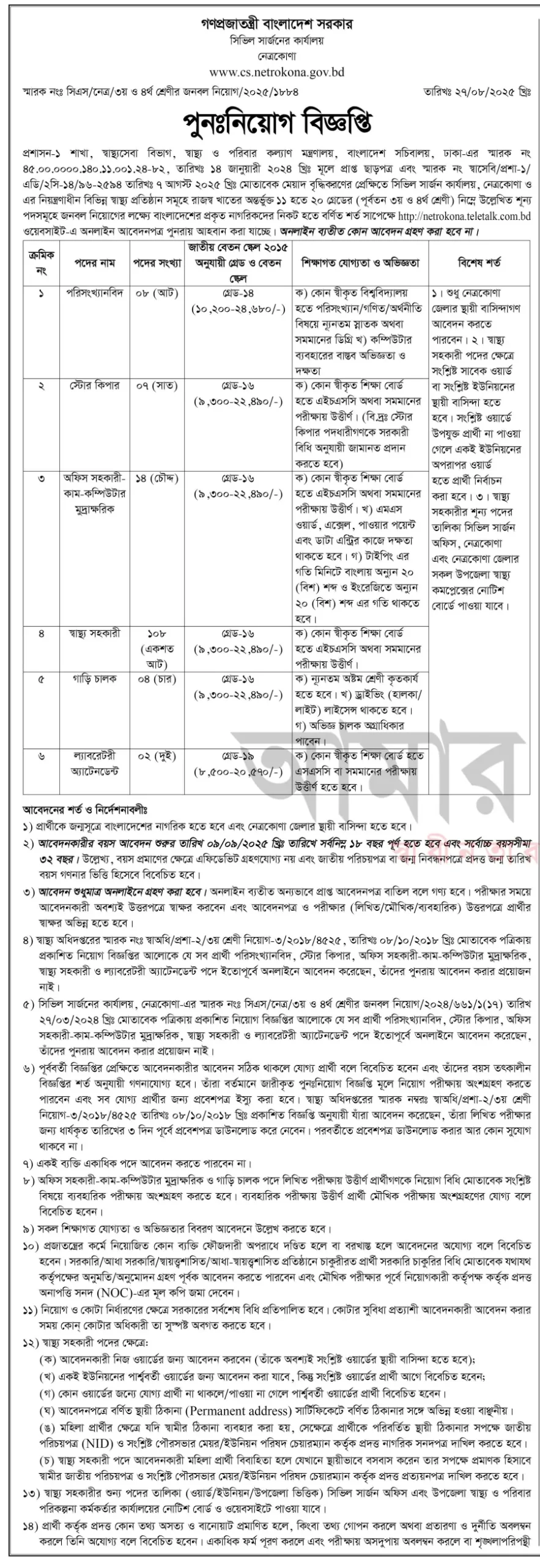 নেত্রকোণা সিভিল সার্জনের কার্যালয় ও এর আওতাধীন বিভিন্ন স্বাস্থ্য প্রতিষ্ঠানসমূহে রাজস্ব খাতভুক্ত মোট ১৪৩টি শূন্য পদে নতুন নিয়োগ বিজ্ঞপ্তি প্রকাশ হয়েছে।